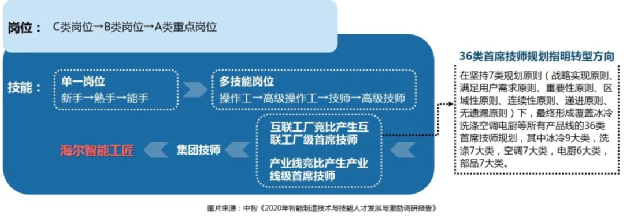 一线员工从C类到B类岗位再到A类重点岗位,技能从单个岗位的新手、熟手、能手到多技能岗位的操作工、高级操作工、技师、高级技师;通过互联工厂的竞比产生互联工厂级首席技师,产业线竞比产生产业线级首席技师,到集团级首席技师。最终通过评选,诞生一线体创客的最高荣誉——海尔智能工匠。