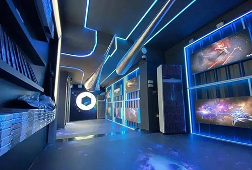 这是一间充满fashion感的“太空舱”。每个季度,这里会作出内容上的更换。当前是主打科幻主题概念,场馆展示柜主要售卖《三体》《“太空漫游”四部曲》等科技类图书,而其陈设更还原了《三体》“水滴”、“三体世界”、“浩瀚宇宙”等场景概念。