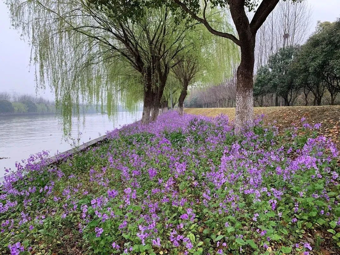 拦路港以“蓝色”为主基调,沿线种植了鸢尾、玛格丽特和二月兰,春天漫步拦路港,享受蓝色花海。
