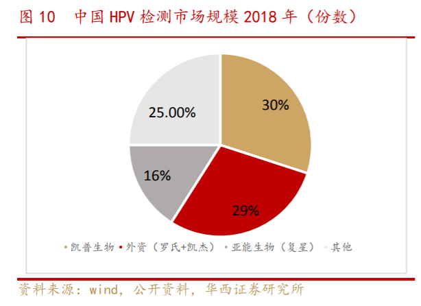 在目前中国的HPV检测行业,之江生物的规模与龙头企业差距较大,产品价格也较低。目前国内获批100多个HPV分子诊断试剂,涉及40-50家企业,其中生产销售成规模的仅10余家,根据华西证券的研报显示,按照份数统计,凯普生物的HPV产品(466.41万份)占据了市场的1/3份额。凯杰、罗氏等进口厂家约占1/3,亚能、透景、港龙、之江、华大等国产厂商约占1/3。