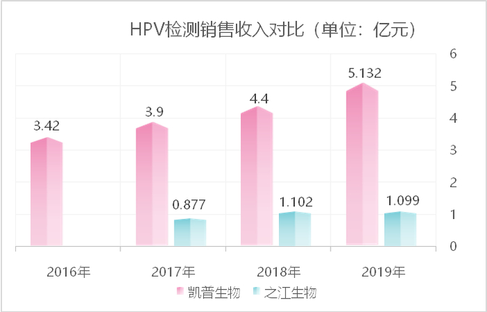 2017年至2019年,凯普生物的HPV检测销售收入从3.9亿元上涨至5.132亿元,而之江生物在2019年对应的收入只有1.099亿元。