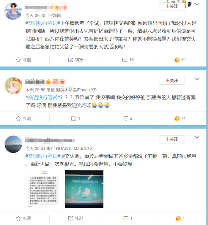 27日,继中国银行因校招笔试题目难度登上热搜后,交通银行再次“中枪”。不少参加笔试的考生在微博发文称,在考试过程中,因系统出现崩溃,出现无法提交试卷的情况。