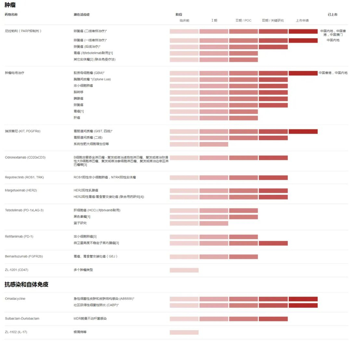 这家成立6年的公司,通过授权引进以及内部研发的方式,搭建起丰富的产品组合,包含16种产品及候选药物,其中9个处于临床后期开发阶段,与超过10家国际生物制药公司建立了合作伙伴关系,包括GSK、Novocure、Deciphera等。