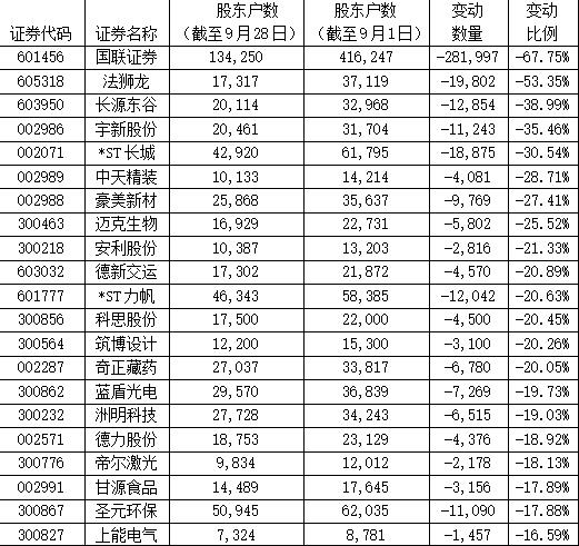 这当中,国联证券(601456)、法狮龙(605318)、长源东谷(603950)、宇新股份(002986)、*ST长城(002071)、中天精装(002989)、豪美新材(002988)、迈克生物(300463)、安利股份(300218)、德新交运(603032)、*ST力帆(601777)、科思股份(300856)、筑博设计(300564)、奇正藏药(002287)等14股最新披露的股东户数较月初减少超过20%。