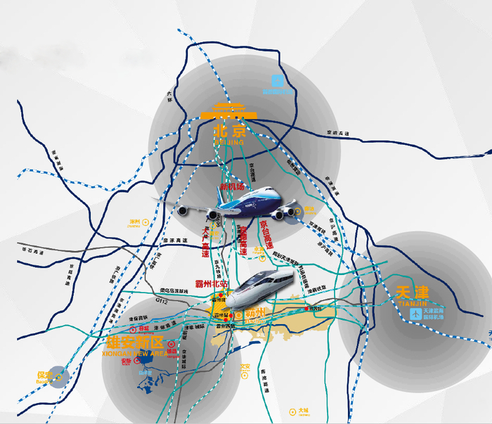 从地理区位来看,霸州位于北京、雄安新区、天津三城核心区位,紧邻雄安新区,按照新的区域交通网络的规划和建设,通达霸州不仅变得名副其实,而且,因其独特的区位优势,这里还成为了京津冀地区同时面向京津雄三个区域增长极的黄金枢纽,通过京雄城际,可以10分钟直达雄安新区,15分钟直达北京大兴国际机场,30分钟直达北京南五环,还可以通过津保高铁20分钟直达天津。相比靠近大兴国际机场的其他城市,霸州最大的优势在于,霸州不仅是连接北京新机场和雄安新区未来经济中心的城市,还是京南地区的重要交通枢纽,还拥有着“五线九横十五纵”的交通网络骨架,是京南地区通往北京、雄安、天津最便捷的城市。区域内部现有津保、京九、津霸3条铁路,大广、京台、荣乌3条高速,紧邻京沪高速,106、112国道交汇贯通,同时随着京雄城际、雄安新区至大兴国际机场快线(R1线)、京德高速、荣乌高速新线等重大基础设施的规划推进,在霸州形成多个“黄金十字交叉”和全方位立体交通网,霸州15分钟可“进京升空”、半小时可“下卫入海”,京南重要交通枢纽的地位日益凸显。