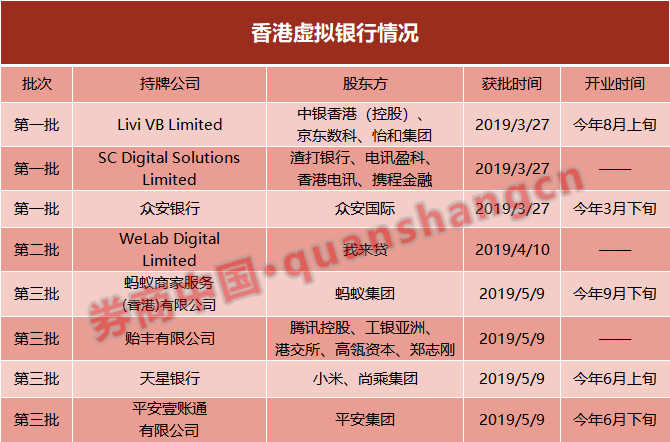 自2019年3月开始,香港金管局先后下发了8张虚拟银行牌照,包括: