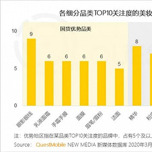 QuestMobile数据显示,细分美妆领域优势地区品牌占有数量中,国货优势品类在眼影眼线、乳液面霜、手霜手膜、眉笔眉粉等,而欧美品牌优势品类在精华、粉底、口红、香水、气垫等,这侧面证明了如完美日记等国货品牌目前并未具备全产品线优势,且主攻的仍是低价美妆产品,在精华、粉底等高价产品上较为乏力。