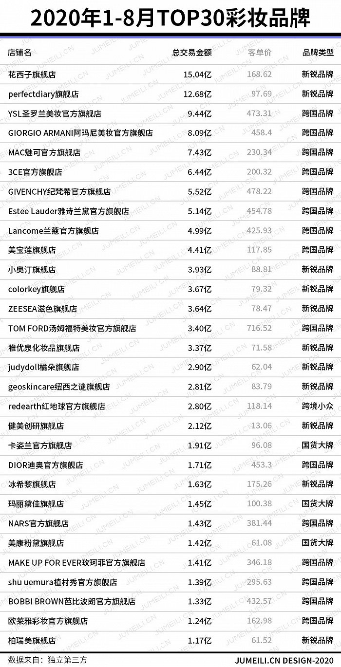 2019年完美日记第二次参加双十一时,成为首个登顶天猫双十一彩妆榜的国货品牌,但根据聚美丽平台数据显示,2020年1-8月TOP30彩妆品牌交易额榜单中,花西子以15.05亿领先,完美日记以12.68亿位居其后,其中5月至7月,完美日记在这个榜单的排名分别是第五、第四、第七,而花西子一直排在榜首。
