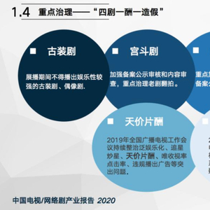 2020年4月第26届北京电视节目交易会(2020·春季)曾发布《中国电视/网络剧发展报告(2020)》,报告称影视领域将重点治理“四剧一酬一造假”,首先是古装剧,特别是在70周年献礼展播期间,对一些娱乐性较强的古装剧、偶像剧都做了调控。其次,对宫斗剧的限制这几年应该说越来越严格,特别是对一些比较经典的老剧在翻拍时有了更多限制。对天价片酬的限制以及对收视造假的严加控制,成为这两年行业乱象治理的主题。