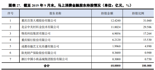 马上消费金融官网显示,2015年6月,马上消费金融正式开业,是经银保监会批准的持牌消费金融公司,注册资本40亿元,其股东包括重庆百货(600729.SH)、北京中关村科金技术有限公司、物美科技集团有限公司、重庆银行(01963.HK)、阳光财产保险股份有限公司、小商品城(600415.SH),目前对应的持股比例依次是31.06%、29.506%、17.264%、15.53%、4.99%、0.9%、0.75%。其中,重庆百货的实际控制人为重庆市国资委。