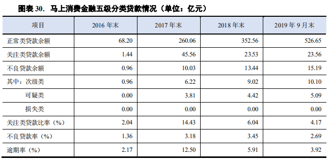马上消费金融ABS资料显示,截至2016—2018年及2019年9月末,马上消费金融的在贷余额分别为70.6亿元、315.6亿元、389.5亿元和565.4亿元。