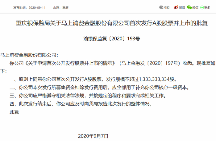 银保监会官网9月11日信息显示,重庆银保监局已于近日批复了马上消费金融首次发行A股股票并上市的申请,发行规模不超过13.33亿股。