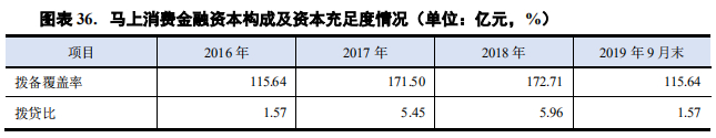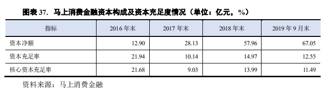 业务规模的不断扩张持续消耗着资本金。新世纪的评级报告显示,2016年至2019年9月,马上消费金融的核心资本充足率分别为21.68%、9.03%、13.99%、11.49%,核心资本充足率游走在监管红线边缘。而根据监管要求,消费金融公司应遵循非系统性重要商业银行监管指标:资本充足率≥ 10.5%,一级资本充足率≥ 8.5%,核心一级资本充足率≥ 7.5%。