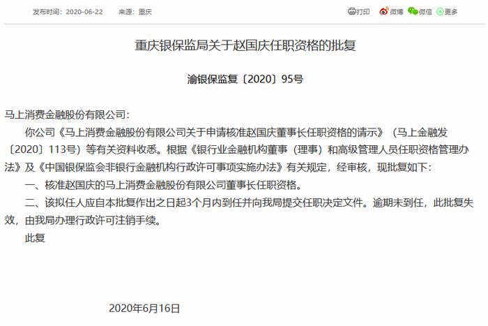 赵国庆作为马上消费金融的创始人,自公司成立以来一直担任总经理一职。今年3月,马上消费金融第一大股东重庆百货(600729.SH)发布公告称,赵国庆先生将担任重庆百货总经理,重庆百货目前持有马上消费金融31.06%的股份。6月16日,重庆银保监局批准马上消费金融创始人赵国庆担任公司董事长一职,同时,赵国庆还卸任了公司总经理。至此,赵国庆不再担任总经理职务,现任马上消费金融董事长。