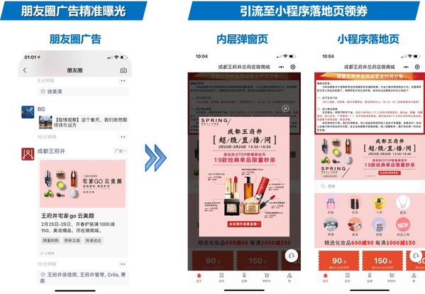 例如成都王府井发起的“宅家go”在线美妆促销活动,就是通过朋友圈广告的精准曝光,引流官方小程序商城而完成的。此举助力企业主以更加快捷的线上小程序直购链路,打通从广告触达到交易转化的购百线上增长通道。