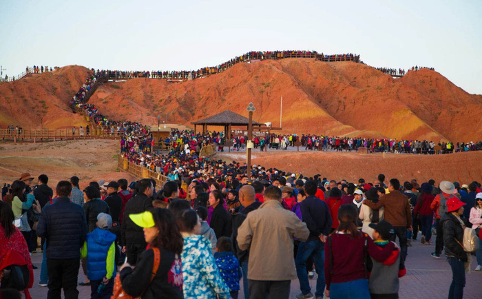 2018年10月5日,张掖丹霞地质公园迎来客流高峰,傍晚时分,大量游客聚集在景区,多个观景台前排起了长龙,如同“人肉长城”,场面壮观。图/IC
