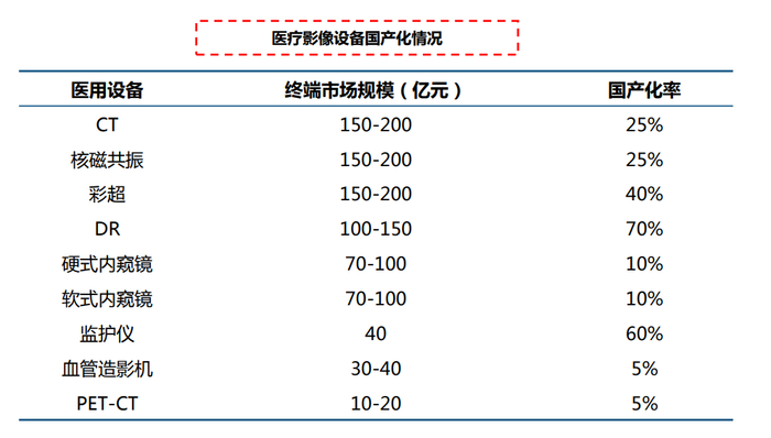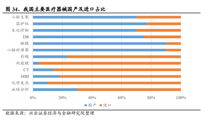 但与之相对的是,像神经介入器械、手术机器人、人工关节等高精尖领域的专科耗材,国产和进口的比例几乎倒置;而除了耗材之外,高端医疗设备领域也由外企垄断,80%的CT市场、90%的超声波仪器市场、90%的磁共振设备均为国外品牌所占据。