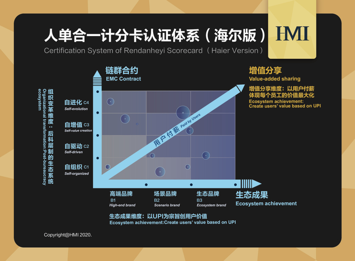 海尔为横轴和纵轴各阶段赋予不同的分值,通过增值分享机制连接,动态优化。人单合一计分卡,使得生态价值可以量化衡量,并且指明了优化路径,从而实现了对生态企业的评估和管理。