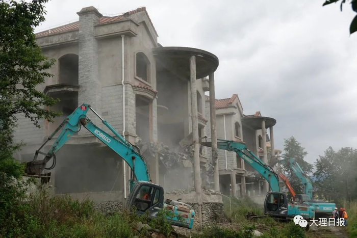 原标题:靠苍山近洱海,单价超3万,大理55栋高尔夫别墅被拆除,多辆挖掘机同时作业