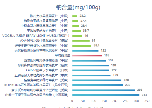 出前一丁椰子风味混合水果谷物脆钠含量最高为314mg/100g,欧扎克水果坚果麦片钠含量最低为23.2mg/100g,钠含量最高和最低相差13倍。