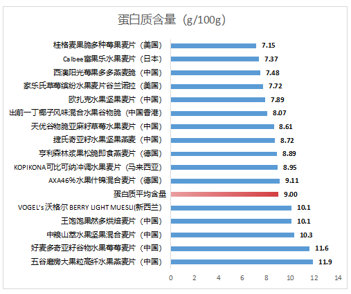 检测结果显示:16款水果麦片的蛋白质检测值在7.2-11.9g/100g之间,国内品牌比国外品牌总体含量高,国内品牌平均蛋白质含量9.4g/100g,国外品牌平均蛋白质含量为8.5g/100g。五谷磨房大果粒高纤水果燕麦片、好麦多奇亚籽谷物水果莓莓麦片、中粮山萃水果坚果混合麦片、王饱饱果然多烘焙麦片的蛋白质含量相对较高,Calbee富果乐水果麦片、桂格麦果脆多种莓果麦片的蛋白质含量相对较低。根据GB 28050-2011《食品安全国家标准-预包装食品营养标签通则》规定,每100g蛋白质含量≥20%NRV的食品可以称为高蛋白质食品,五谷磨房大果粒高纤水果燕麦片每100g蛋白质含量=20%NRV,是16款水果麦片中唯一一款高蛋白食品。