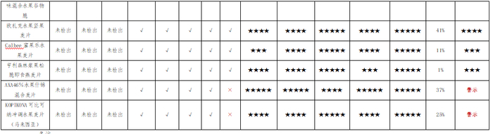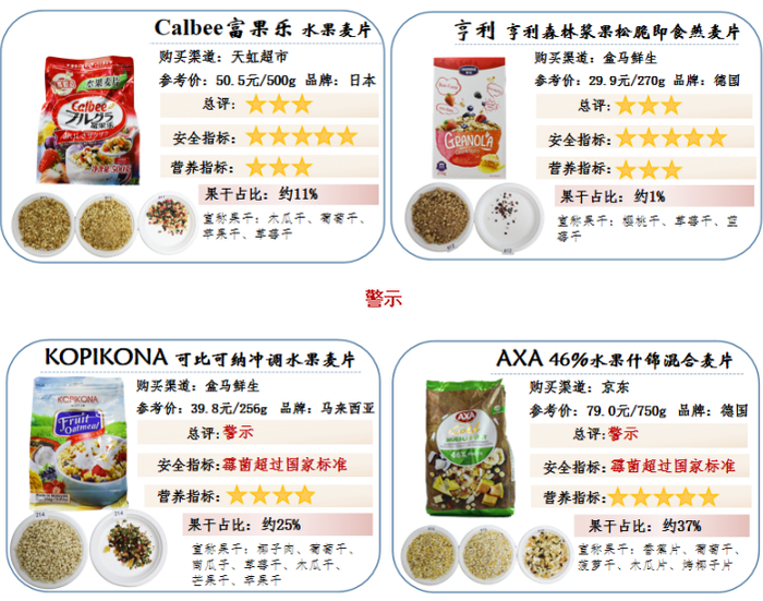 3. 2款样品(AXA46%水果什锦混合麦片、KOPIKONA可比可纳冲调水果麦片)霉菌指标超出GB 19640-2016《食品安全国家标准 冲调谷物制品》的限量值,予以警示,不参与本次评级;