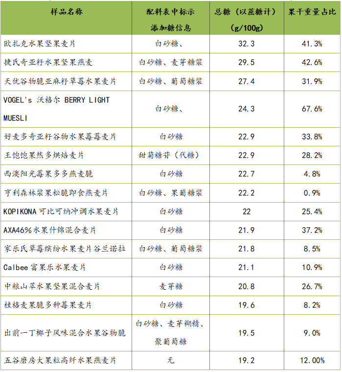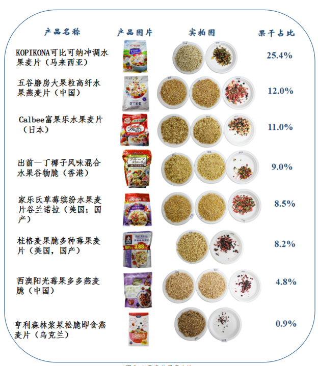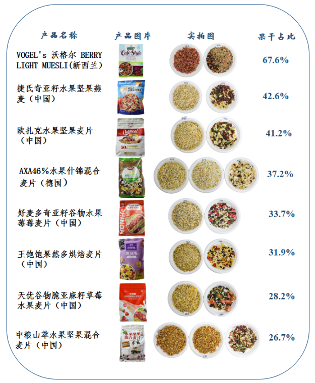 4. 本次比较试验的果干占比为可分离果干的占比,部分品牌麦片和果干黏连在一起,无法分开;