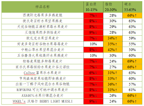 五、标签标识:欧扎克、可比可纳、王饱饱3个品牌的水果麦片部分营养指标的实际检测值与其标签标示值不符。