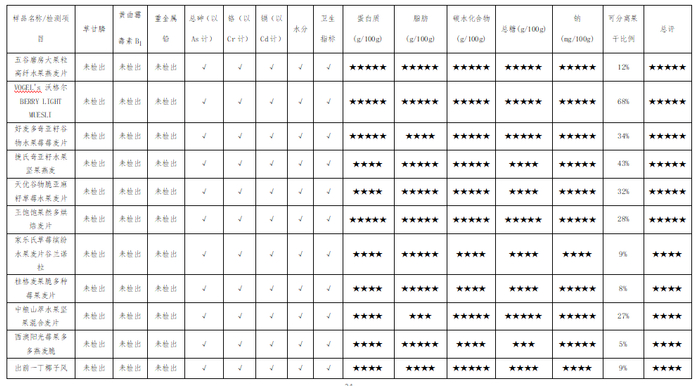 四、综合评价:五星水果麦片样品共6款,国内品牌5款:五谷磨房、好麦多、捷氏、天优、王饱饱,其中前4款为深圳品牌,国外品牌1款:VOGEL’s沃格尔。