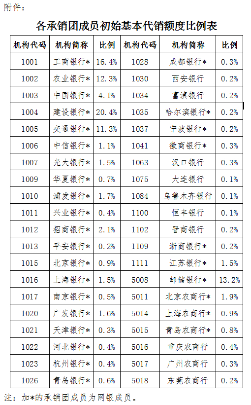 通知指出,两期国债由40家2018-2020年储蓄国债承销团成员(以下简称承销团成员)通过网点柜台代销。为统筹做好常态化新冠肺炎疫情防控与储蓄国债发行工作,承销团成员要严格遵守属地和监管部门疫情防控要求。中国工商银行(4.920, 0.01, 0.20%)等30家承销团成员(以下统称为网银成员,详细名单见附件)同时通过其网上银行代销。各承销团成员初始基本代销额度比例详见附件。