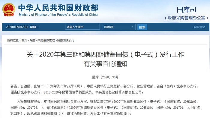 据财政部网站29日消息,财政部、人民银行发布《关于2020年第三期和第四期储蓄国债(电子式)发行工作有关事宜的通知》。通知指出,为筹集财政资金,支持国民经济和社会事业发展,财政部决定发行2020年第三期储蓄国债(电子式)(国债简称:20储蓄03,国债代码:201703,以下简称第三期)和2020年第四期储蓄国债(电子式)(国债简称:20储蓄04,国债代码:201704,以下简称第四期)。