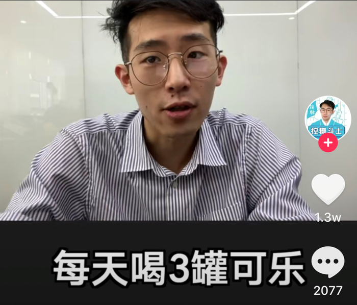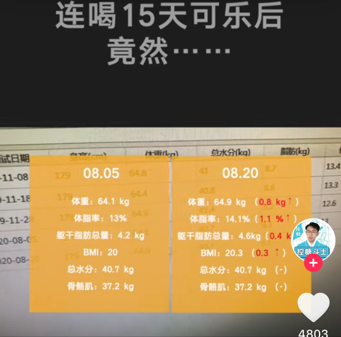 在某短视频平台上,有一位网络博主为了探究含糖饮料对于身体的影响,于是他拿自己做了个实验: