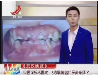 为男孩接诊的武汉大学人民医院口腔科主任彭友俭介绍,“这是我当牙科医生30年来,碰到的最惨不忍睹的牙齿。我们把喝饮料导致的这种烂牙叫做‘可乐牙’,因为大部分饮料尤其是碳酸饮料,pH值通常在2.2-4.9之间,而牙齿表面的珐琅质,溶解临界值是5。再加上饮料中的高糖,也会发酵产酸,导致牙釉质脱矿溶解。”