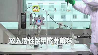 22分钟后甲醛浓度趋于稳定,置入活性锰分解毡。