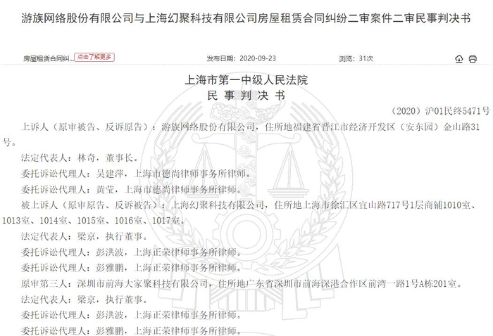 上海市徐汇区人民法院民事判决书((2018)沪0104民初23716号)显示,原告(反诉被告)上海幻聚科技有限公司(以下简称“幻聚公司”)与被告(反诉原告)游族网络股份有限公司(以下简称“游族公司”)房屋租赁合同纠纷一案,法院于2016年11月2日立案受理后,游族公司向法院提起反诉,法院予以合并审理。法院依法适用普通程序审理,法院于2018年4月27日作出(2016)沪0104民初31680号民事判决后,幻聚公司不服提起上诉,2018年9月28日上海市第一中级人民法院依法裁定,撤销原判,发回重审。本院再次立案受理后,适用普通程序,依法另行组成合议庭。审理中,法院依法追加深圳市前海大家聚科技有限公司(以下简称“深圳前海公司”)为本案第三人。本案现已审理终结。