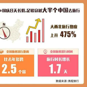 与上半年假期更多是周边游不同,随着疫情在全国范围内进一步得到控制,大众的出行半径也越来越远。携程数据显示,旅客出行时间预计比去年增长1.7天,多跨越2.5个省的距离,“穿越大半个中国”成国庆旅行新趋势。