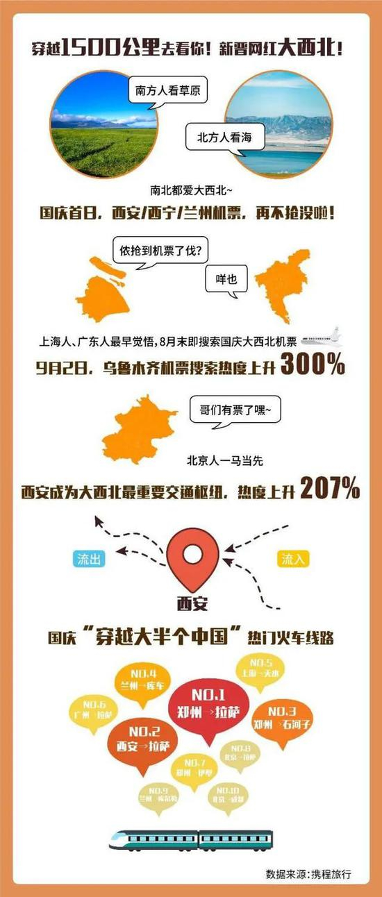 数据显示,国庆期间,上海赴西宁的机票搜索热度上涨307%。广东人赴兰州机票搜索热度上涨205%。此外,飞往乌鲁木齐的机票也登上热搜排名,搜索量一度攀升300%。西安成大西北最热门国庆交通中转枢纽,热度上升207%。