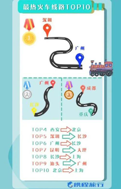 从出行时间上来看,火车出行时点相对集中。从9月28日开始,火车票出票量明显增长,出行高峰集中于9月29日—10月1日,返程高峰在10月7日—8日。深圳-广州、长沙-广州、成都-重庆等线路热度最高,北京、上海、成都等车票销量最好。