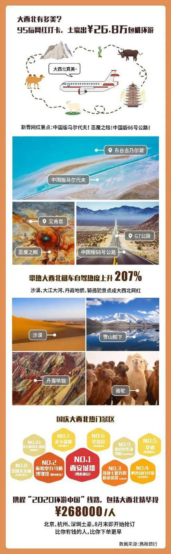 此外,“大西北”热也带动相关区域的租车热度上升207%。据携程相关人士透露,此前携程曾推出价值26.8万元的携程“2020环游中国”,涵盖西北地区多个精品旅游区域,该套餐一经推出,就受到了来自北京、杭州、深圳的“土豪”们的抢订。