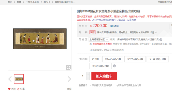 1984 年发行的《簪花仕女图》小型张,目前市场价 2200 元一枚。