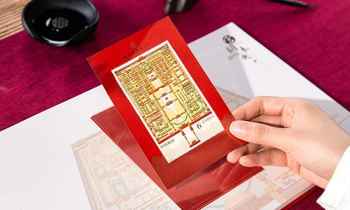 他对图案上的屋顶、廊柱反复进行了考证,将故宫建筑群的恢弘之美展现地淋漓尽致。这也是故宫平面图第一次在邮票上完整呈现,意义非凡。