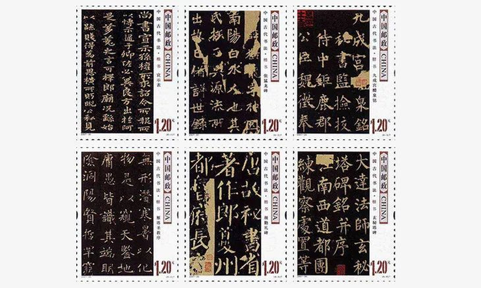 楷书:邮票书法选自《宣示表》《张猛龙碑》《九成宫醴泉铭》《雁塔圣教序》《颜勤礼碑》《玄秘塔碑》。