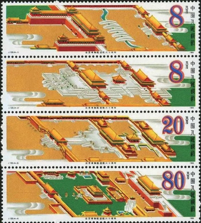 《故宫六十周年》是中国发行的第一套纵向四连张邮票,票型为 93 × 26 毫米,票幅之长创造了新中国邮票的纪录,很有收藏意义。