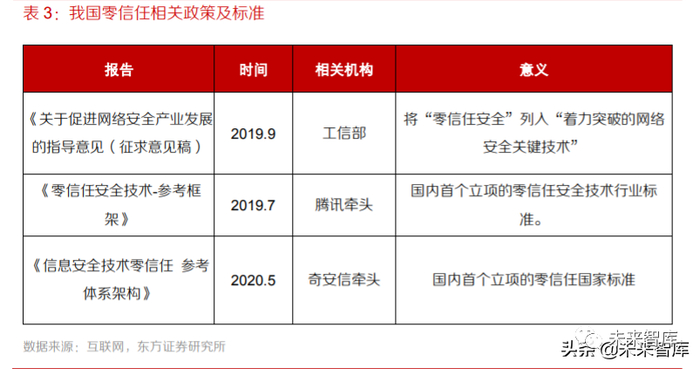 我国零信任亦紧锣密鼓地展开,标准及应用案例逐渐落地。2019 年 9 月,工信部发布的《关于促 进网络安全产业发展的指导意见(征求意见稿)》中将“零信任安全”列入需要“着力突破的网络 安全关键技术”。2019 年 7 月腾讯牵头提交的《零信任安全技术—参考框架》行业标准通过评审,成为我国首个立项的零信任安全技术行业标准。此外,奇安信发起的零信任首个国家标准《信息安 全技术零信任 参考体系架构》已成功立项。同时,自 2019 年起国内部分机构也开始将零信任作 为新建 IT 基础设施的安全架构,能源、银行、通信等行业也针对新型业务场景开展零信任技术的 研究及试点工作。
