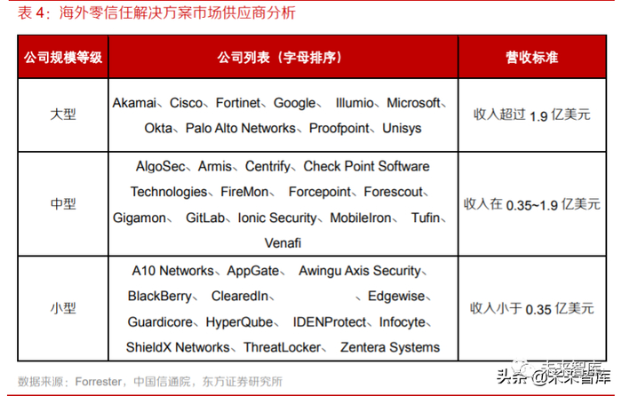 海外零信任起步较早,目前已初具规模。Google、Microsoft 等巨头率先在企业内部实践零信任并 推出了完整的解决方案;OKTA、Centrify、Ping Identity 等为代表的身份安全厂商推出“以身份为 中心”的零信任方案;Cisco、Symantec、VMware、F5 等公司推出了偏重于网络实施方式的零信 任方案;此外 Vidder、Cryptzone、Zscaler、Illumio 等创业公司亦表现。根据 Forrester 在 2020 年二季度对于零信任产业的统计数据,按照零信任解决方案收入规模,市场的供应商可分为三类, 其中零信任相关营收超过 1.9 亿美元的厂商已超过 10 家,海外零信任已经进入规模化产业发展 阶段。