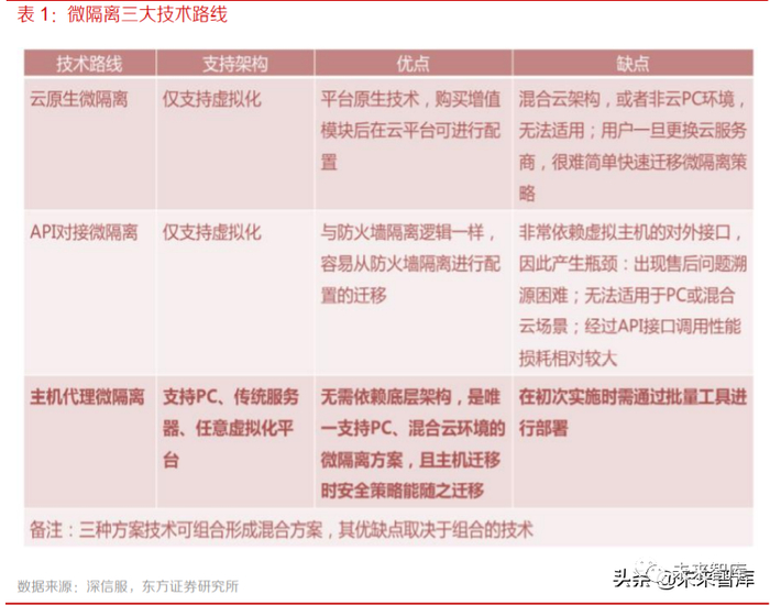 微隔离通过细粒度的策略控制,可以灵活地实现业务系统内外部主机与主机的隔离,让东西向流 量可视可控,从而更加有效地防御黑客或病毒持续性大面积的渗透和破坏。当前微隔离方案主要有 三种技术路线,分别是云原生微隔离、API 对接微隔离以及主机代理微隔离,其中主机代理微隔离 更加适应新兴技术不断更迭及应用带来的多变的用户业务环境。