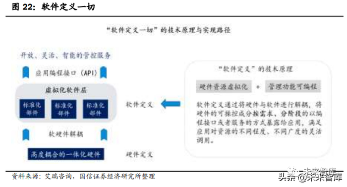 汽车软件成为未来汽车构架重要组成部分。而整车电子电气构架提供的硬件、 操作系统实现的管理功能、基础软件平台构架实现的抽象化为 SDV 不可或缺的 三大关键部分,软硬件的分离(研发分离、功能发布分离)成为实现 SDV 基础。