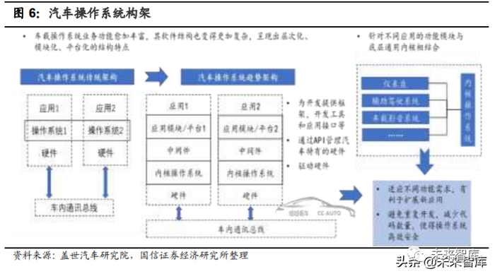 操作系统实现管理功能。车载操作系统(Car-OS)承担着管理车载电脑硬件与 软件资源的程序的角色。20 世纪 90 年代伊始,汽车上基于微控制芯片的嵌入 式电子产品的应运兴起,需加入相关的软件架构以实现分层化,即汽车电子产 品均需要搭载嵌入式操作系统。从产品品类上,汽车电子产品可归纳为两类, 一是以仪表,娱乐音响、导航系统为代表的车载娱乐信息系统;二是主管车辆 运动和安全防护的电控装置。两者对比而言,电控系统更强调安全性和稳定性, 因此应用于电控单元 ECU 的嵌入式操作系统标准更为严格。未来操作系统发展 面临两大趋势,一是以 OSEK、AUTOSAR 为典型代表的操作系统标准联盟将 定义统一的技术规范;二是智能网联趋势下数据融合度提升,由于各个部件的 安全标准等级不一从而整车上存在多种操作系统的运用,通常引入虚拟机管理 (可提供同时运行多个独立操作系统的环境),如在智能座舱 ECU 中同时运行 Android(车载电子操作系统)和 QNX(电控操作系统)。