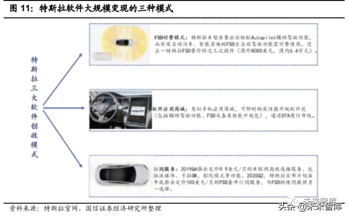 特斯拉已构筑初阶车企软件盈利模式。硅谷出身的特斯拉已证实一条软件大规 模变现的可行性路径,分为 FSD 付费、软件应用商城及订阅服务三种模式: