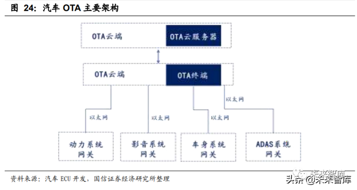OTA 由特斯拉引领,向全行业普及。由特斯拉最先推行的 OTA 升级功能模块 能持续修复汽车软件缺陷、解决部分故障、解锁或引入新功能以满足用户需求, 成为汽车软件发展的主流趋势。按照升级对象的不同,OTA 可分为 FOTA(硬 件在线升级)、SOTA(软件在线升级)两个大类,其中 FOTA 主要针对基础硬 件和汽车底层安全相关功能的升级需求,例如刹车系统、制动系统及 BMS 等;SOTA 主要对座舱娱乐系统进行升级。对 ECU 而言,其内部为备份软件准备了 额外区域空间,以备当前运行程序出现故障或升级中发生断错误时自动滚回备 份软件系统,防止车辆出现安全事故。